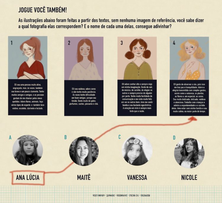 Uma das atividades propostas por Vanessa Schultz durante a oficina envolveu a descrição em texto de cada um dos participantes sem que fosse mencionada nenhuma característica física ou identificação. Essas descrições foram entregues para a ilustradora Flávia Fernandes de Oliveira, parceira do projeto, que os desenhou a partir do relato de cada um apenas, sem nenhuma referência de imagem.