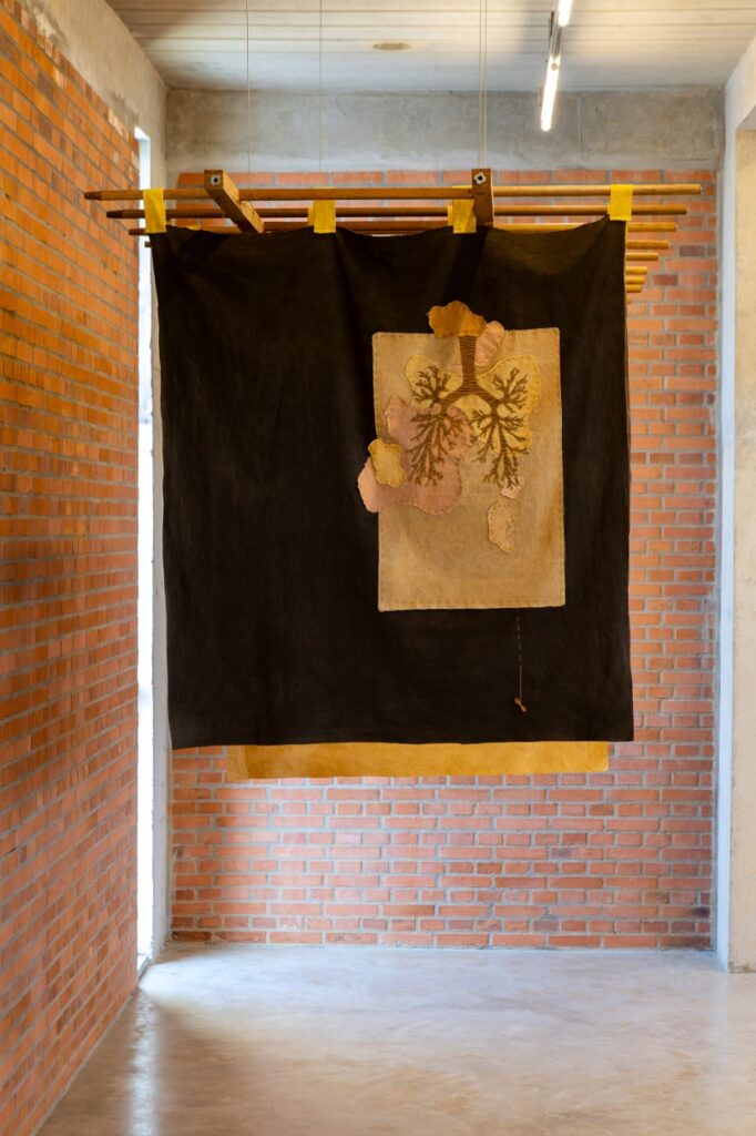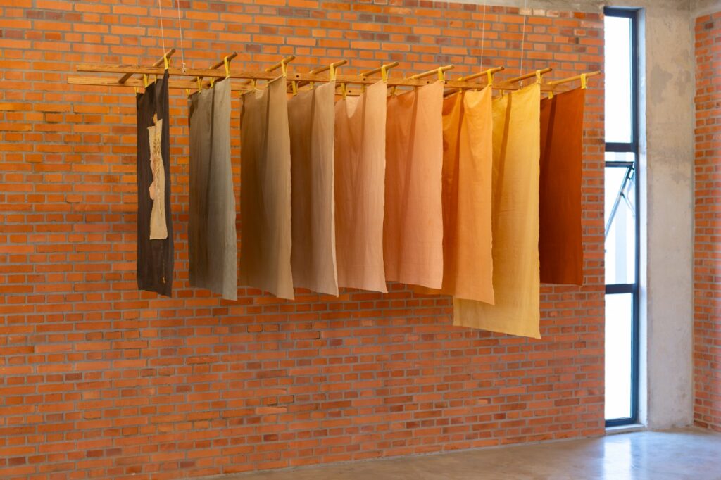 A cartela exposta é feita em algodão cru nas medidas de 120 x 120 cm e realizada a partir de cores de terras, uma das técnicas redescoberta por Marion como um ato manifesto na sua produção. Em Doutor Pedrinho (SC), ela investiga o potencial dessa matéria-prima basilar, obtendo uma gama elegante de cores, sem utilização de produtos químicos, além daqueles derivados da própria natureza. “A intenção é mostrar que é possível obter cores naturais lindíssimas sem poluir”, afirma a designer que se contrapõe à indústria que mais polui o planeta, a indústria da moda.