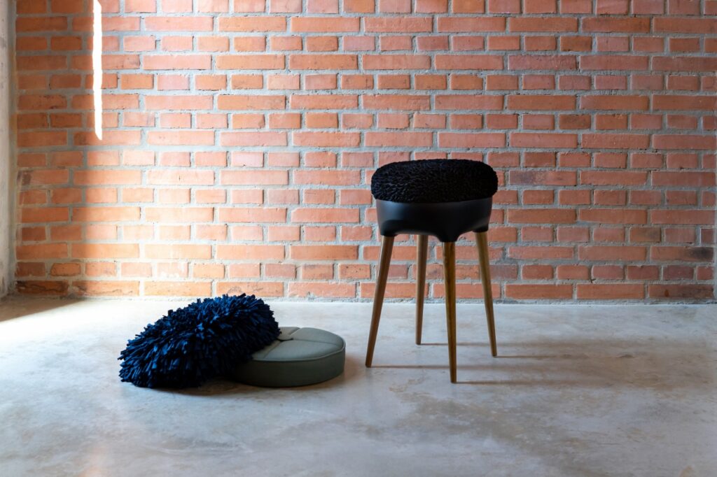 A boneca Emília, do Sítio do Pica Pau Amarelo, foi a referência para a Banqueta Lola II, composta por um assento confeccionado com sobras de tecido acoplado ao corpo laminado em fiberglass que recebe pés torneados de madeira certificada. Como as luminárias, a peça também foi projetada para ser de fácil montagem e oferecer variedade de padronagens de tecidos.