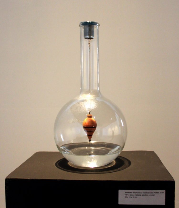 O texto no cartaz da mostra “Máquinas do Abismo”, selecionada no projeto Espaços Visuais – Rede Sesc de Galerias 2016, revela ironia, um outro dado a ser considerado nesta trajetória. Em “Instruções do Mundo e dos Objetos Materiais – notas para o entendimento e o controle da ocorrência obscura das invenções, ou o próprio ato de ver, incluindo o ver da imaginação, onde das coisas vistas se abrem frestas de outras dimensões”, o artista escreve: “Os estados de imagem se sobrepõem aos estados materiais, o que torna viável um objeto antes do nome. Pelo mesmo motivo é relevante considerar o espaço entre as coisas como campo de construção do processo. Dos objetos materiais devem-se considerar suas frestas e contra formas como setas direcionadas para o invisível”.