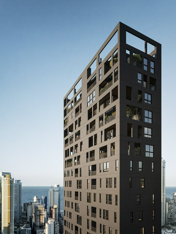 Começamos com um convite para concorrer em um projeto em Balneário Camboriú, o Origem, da Neuhaus Inc. Já havia um partido aprovado, então nosso papel foi mais estético-conceitual. Fizemos mudanças significativas na configuração e na linguagem do edifício, buscando mais coerência com o entorno e com os valores que defendemos. Era um projeto técnico pré-aprovado e nosso trabalho era puramente estético-conceitual…