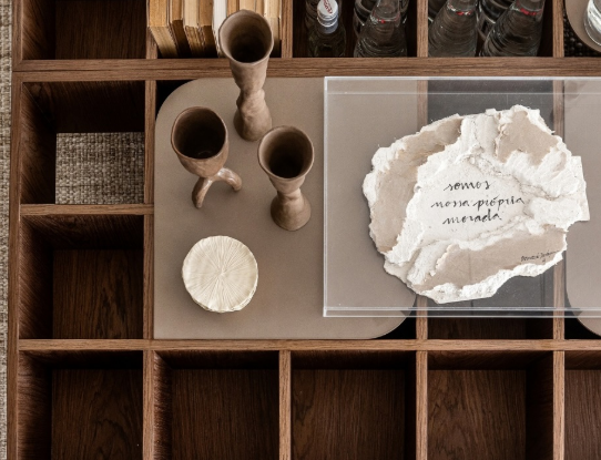 As escolhas de mobiliário, arte e objetos evidenciam o traço da dupla: a forte presença do design autoral, com peças assinadas por nomes que fazem do desenho e da matéria linguagem e pesquisa. Destaque para a obra do artista Paulo Gaiad (1953–2016), que captura o olhar logo na entrada da loja. As peças da ceramista Mary Akemi, do a.terra estúdio, poderiam estar deslocadas mais à esquerda, evitando interferência na observação da tela.