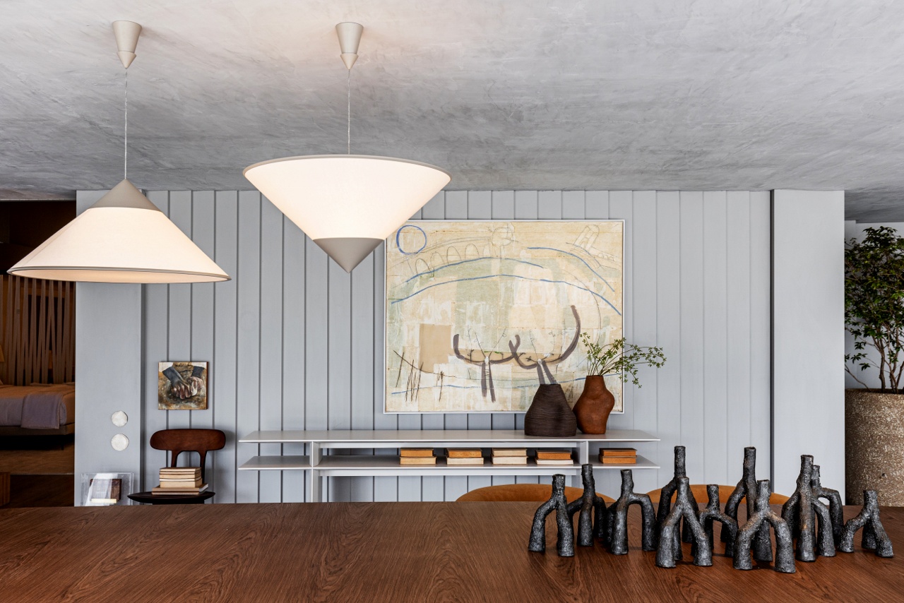 Na área de estar, o sofá Orla convida ao uso, em composição com as poltronas Mimoso, Zípe e Elefante, todas de Maurício Bomfim. A mesa de centro Filamento, de Fabiana Queiroga, estrutura a composição, enquanto as mesas de apoio – Escher, de Ibanez Razzera; Teresa, de Pedro Gallasso; e Taiga, de Ricardo Vidigal – modulam usos e escalas.
